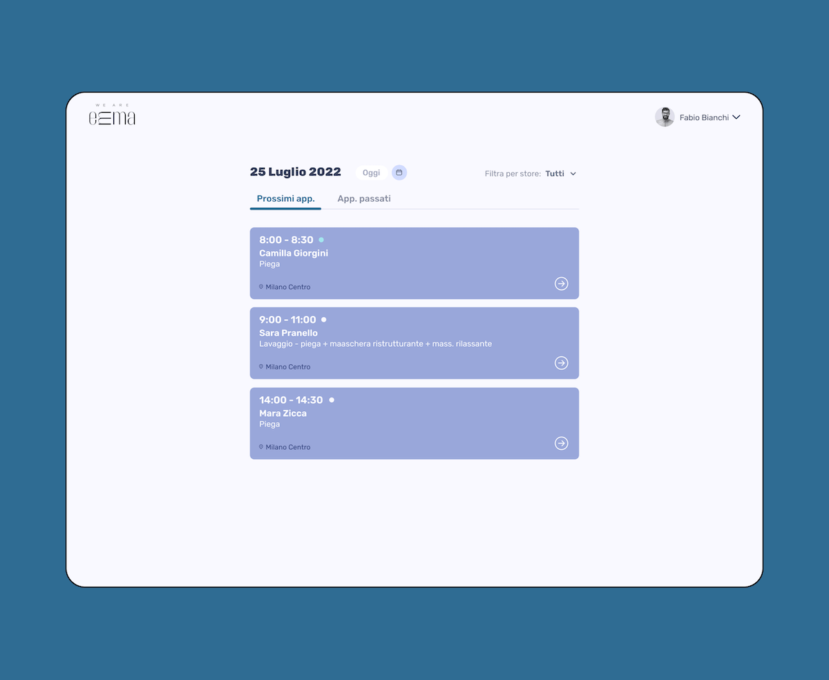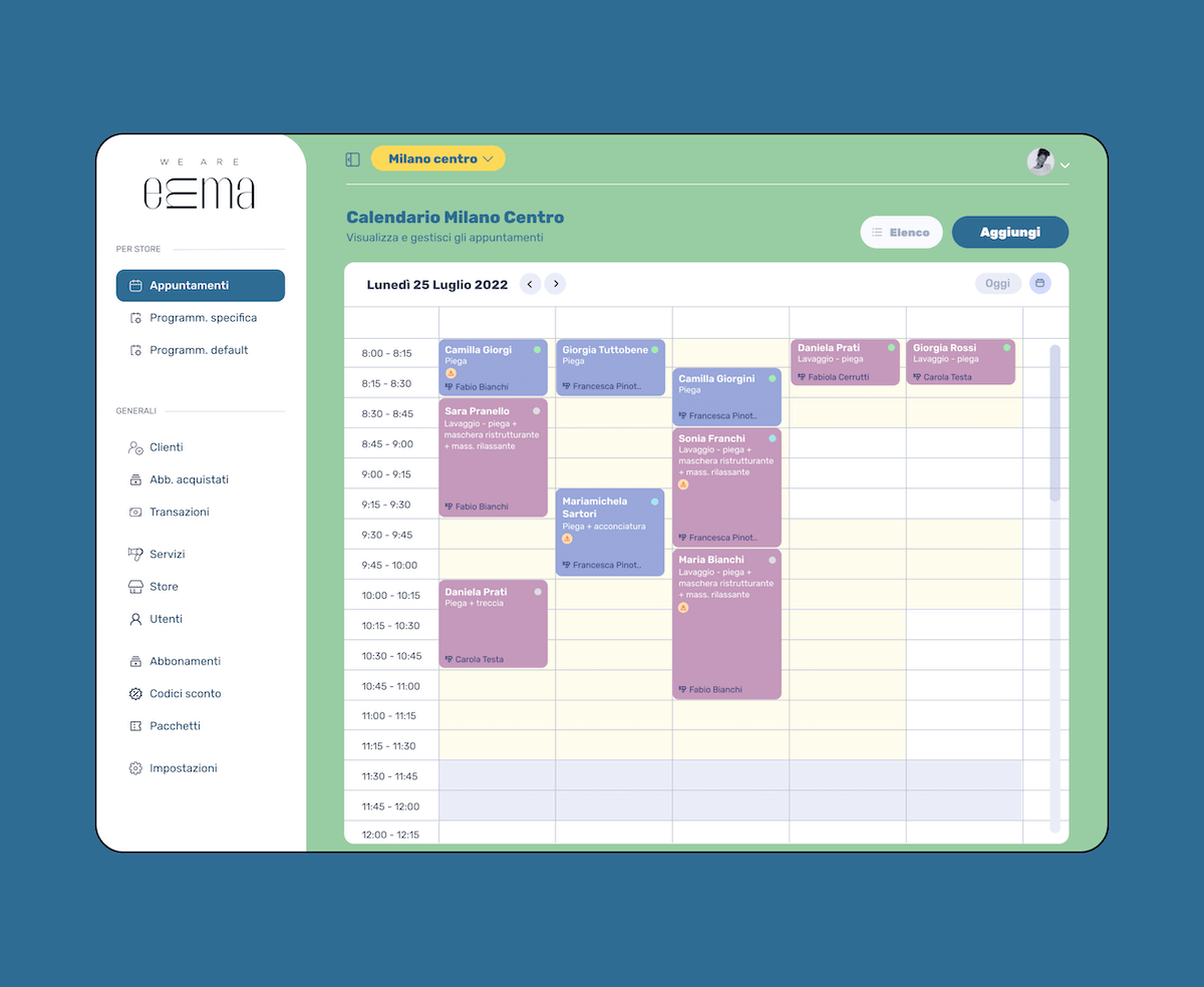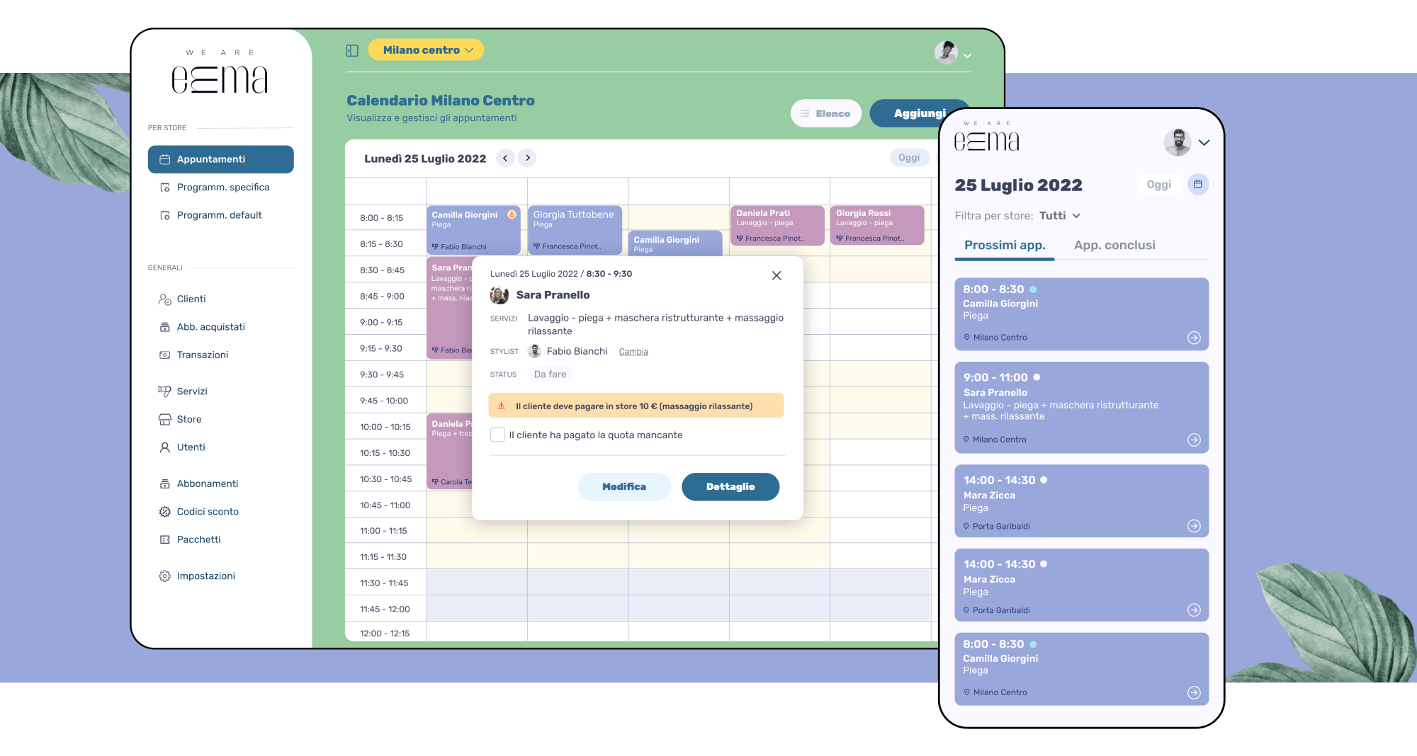 Per We are Emma abbiamo realizzato una web app che permettesse da una parte ai clienti di prenotare gli appuntamenti e dall'altra agli amministratori di gestire tutta l’operatività all’interno degli hair salon della catena.