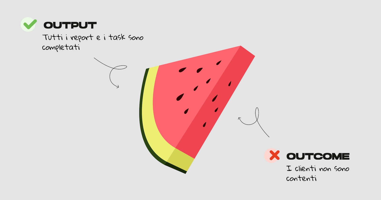 Il rischio di un approccio output-oriented è quello di finire in quel fenomeno che viene chiamato Watermelon effect dove tutti i report e i task risultano completati (semaforo verde), ma quando scavi sotto la superficie, scopri che in realtà i report sul successo dei tuoi outcome sono tutti rossi perché i tuoi clienti in realtà non sono contenti.